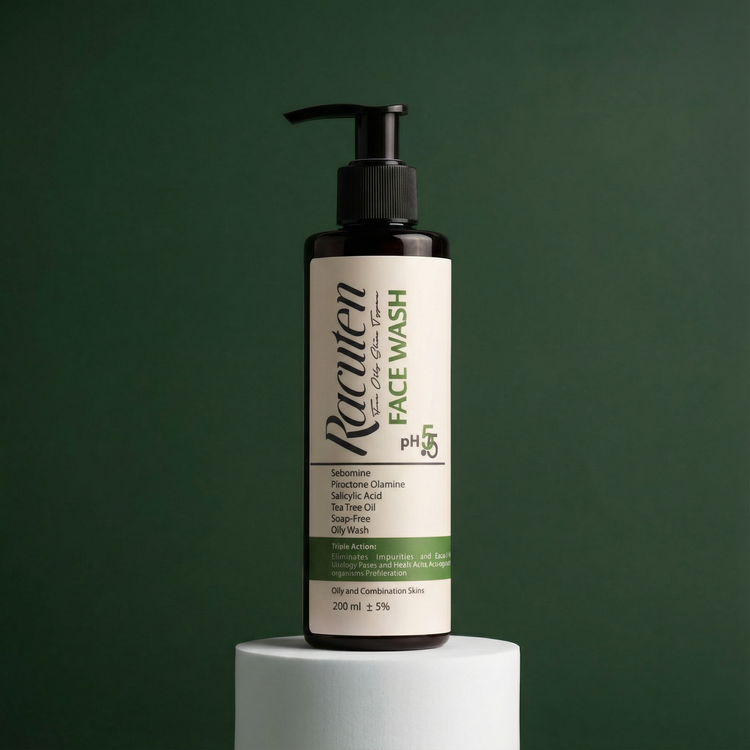 پاکسازی: شروع کنید با ژل شستشوی صورت پوست چرب راکوتن برای شستشوی پوست و از بین بردن چربی اضافی.