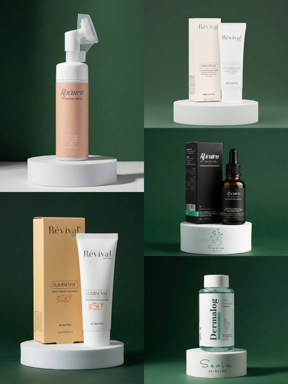 کرم آبرسان خشک رویوال، ضد آفتاب روشن کننده رویوال، سرم آلفا آربوتین راکوتن، فوم روشن کننده راکوتن، تونر پوست خشک درمالوگ